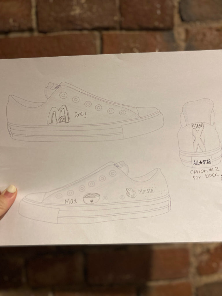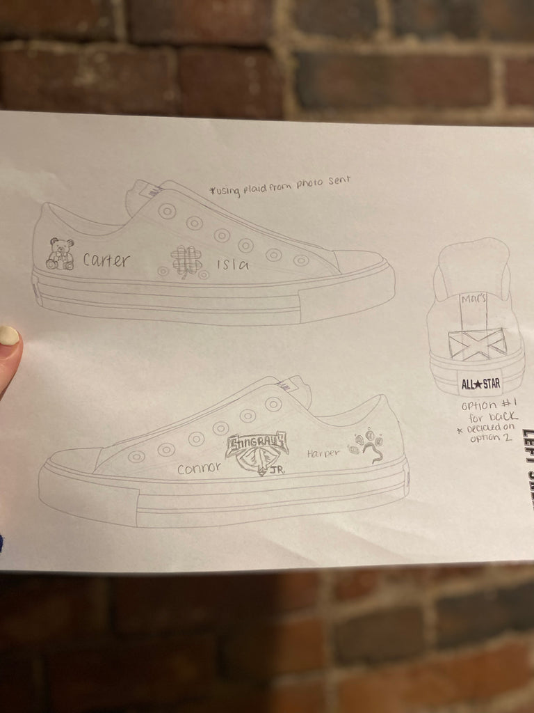 Custom Low Top Converse for Tim - agreed on sketch design. Shoes to be shipped in 3-4 weeks.