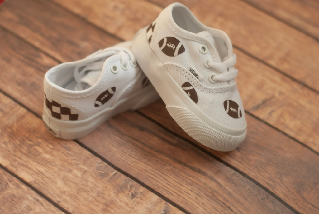 White tie toddler vans with brown footballs handpainted and scattered along the shoe on a wooden floor. The back of the shoe has a brown checkered pattern painted on. One shoe is facing forward and one is facing backwards.